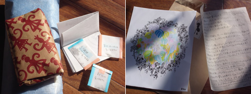 そこで繋がったお友達二人からお手紙をいただきました。 素敵な日常や昔の出来事などが綴られていて、 心にぐぐぐぅーっときました。 お礼に手紙を書くけど、 なかなか時間が無くて、すぐに出せないのでここでお礼をまず書きたいなと思って。 一人は絵を描く人です。 素敵な絵を描きます。 僕は音楽のおかげで、たまに人に絵をもらいます。 どれも大切にとってあります。 もらった時、もらっていいのだろうか…。と思うけど、 また音楽で還そうと思うんですよね。 一人は学校の先生です。 子供達に色々な音楽を聞かせちゃう素敵な先生ですw。 子供はほんと敏感だからなぁ。 京都の美味しい珈琲とおそば、それにいくつかの植物の種をいただきました。 珈琲はさっそくいただいています。 種はどんな芽が出てどんな風に育つか、春までのお楽しみです。 人からの手紙。 おかげで日常はとても豊かです。 ありがとう。 落ち着いたら手紙を書きます。 それと、今週発売のスクウェア・エニックスから発売のコンピ [ LOVE SQ ]が届きました。 ようやく全部聞きましたが、す…凄いです。 ファンの多い音楽だけに賛否両論だろうけど、 素晴らしい心のある音楽の数々。 ぜひ、聞いてみてください。
