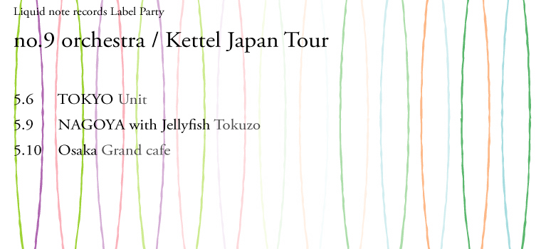no.9とkettelの東京、名古屋、大阪ツアー。 東京ではausとDJ funnel、 大阪ではakira kosemuraとnanofingersと Remixに参加してくれたアーティストも多く共演します。 まずは東京UNITを最高のライブにするために、 今出来ることを全力でやっています。 熱い魂の演奏をぜひ楽しみにしていてくださいね。 先日、Remixに参加してくれたKashiwa Daisukeさんと、 以前お寺のライブでご一緒したKazumasa Hashimotoさんのライブを見てきました。 二人とも僕はかなり前から聞いていたけど、 ほんとに素晴らしいライブと人柄で、 あれ以来、僕の中で熱くほとばしるものがあるんです。 さらに会場にはRemixに参加してくれたametsubや、 僕がお世話になったレーベルcubic musicの杉本さん(filfla/minamo) 僕の全てのCDをディストリビュートしてくれているpdisの下村さん、 今度のツアーに参加してくれるcokiyu、 mergrim & moph ONEのmitsuくん あと、現在haruka nakamuraとツアー中のシンガポールのアーティスト aspidistraflyも一緒に写真撮っちゃったw。 そして、一緒に行ったDrop主宰masaくんと、そうそうたる顔ぶれが居合わせ、 いっぱい話が出来て、とっても刺激的でした。 ※上のリンク、全部myspaceリンクしてるから聞いてみてー。素敵がいっぱいだよ。 今、こうやって繋がって行くアーティストの輪が、 近い将来大きなムーブメントを起こせる予感がしています。 来年、みんなで大きなことが出来れば、 それはそれはきっと素晴らしい未来につながっている気がします。 まずは一歩ずつ、 次のツアーをぜひ見にきてください。 愛を込めて。 ツアーの日程は以下。 :: Kettel & no.9 orchestra Usual Revolution Japan Tour :: 5月6日(祝日) 【会場】東京 UNIT http://www.unit-tokyo.com/ 【日時】2009年5月6日(水) 17:00open/18:00start 【料金】前売り¥3,000 当日¥3,500(D別) 【出演】 LIVE : Kettel / no.9 orchestra / aus with Cokiyu / DJ : Tao / DJ Funnel VJ : michi / Yugo Chiba PA : AO 5月9日(土曜) 【会場】名古屋 TOKUZO http://www.tokuzo.com/ 【日時】2009年5月9日(土) 17:00open/17:30start 【料金】前売り¥3,000 当日¥3,500(D別) 【出演】 LIVE : The Sun calls Stars[伊藤大助(クラムボン) +オータコージ(曽我部恵一BAND,etc)] / Kettel / no.9 orchestra / asana(full band set) DJ : Tao / 脇田康介(三河安城) / cool-k VJ : michi / Yugo Chiba PA : AO 5月10日(日曜) 【会場】大阪 Grund cafe http://grandcafeosaka.com/skins/venues/grandcafe/ 【日時】2009年5月10日(日) 【料金】前売り¥3,000 当日¥3,500(D別) 【出演】 LIVE : Kettel / no.9 orchestra / akira kosemura / DJ : Tao / nanofingers / unity VJ : michi / Yugo Chiba PA : AO 上記イベントのチケットはliquid note recordsまたはチケットぴあ ローソンチケットなどでご購入いただけます。