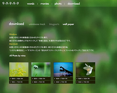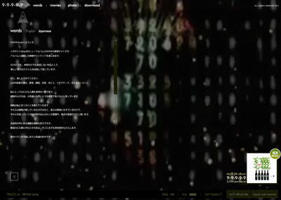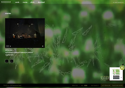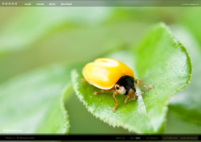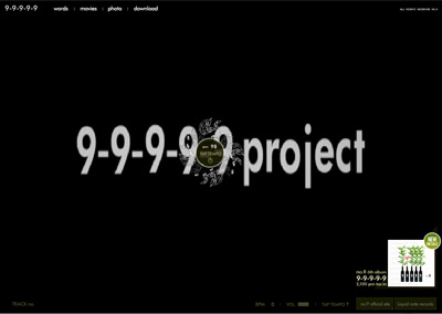 1-10 designの大石さん、岸さん、辻尾さん。 そして、michiくんとmina、ゆうじ?w もちろんliquid note recordsの拓郎もね。 と、どうしても先にこれだけ言いたかったのです。 そして、リリースしましたぁぁぁーーーーーー。 いやぁっほぅい〜(*>▽<)>▽<)キャー この3ヶ月、この事だけを考えて、 やれる事は全てやったと思います。 特に前日っていうか、さっきまでが精神的にきつかったなぁw。 さて、サイトも0時をもってOPEN致しました。 ずっとなんのこっちゃ?と友達にすら理解されない9-9-9-9-9 projectでしたが、 CDとWEB両方無いと説明出来ない感じでして、 それでも説明してみようと思います(汗) まず、 CD [ 9-9-9-9-9 ]をi-tunesやラジカセで再生していただいて、 http://9-9-9-9-9.com へアクセスします。 ※アクセスが集中すると一時的に表示されない場合があります。すみません(涙) すると、こんな感じ↓ 聞いている音楽のリズムに合わせてクリック。 すると、「今聞いているのはこの曲ですか?」と聞かれるので、(下の写真) 曲を選択すると…。 それぞれの映像が見れます。 さらに音楽に合わせてある、追加の音も鳴ります。 全曲そういう映像がありまして、 さらに最後の曲、[ melodion ]ではPCのキーボードで音が出せるんです! ぜひ、曲に合わせてセッションしてくださいね。 あとはですね、 色々な音楽を、目で味わうためのスライドショー。 とか。 僕は言葉が好きなので、 [ Words ]ページもあります。 そしてそして、 [ movie ]では6曲目に収録されている [ Re: Bug Beats ]のPVと、 CDに収録されていない曲で創ったmusic clip [ Insect eyes ]、 さらにさらに、no.9 orchestra LIVE@UNIT 2009の模様などがご覧になれます。 最後に[ Download ]では、 アンリリース曲を2曲、ブログパーツ、デスクトップピクチャが、 ご自由にダウンロード出来ます。 これは僕からの感謝のつもりです。 これら全てがアルバム [ 9-9-9-9-9.com ]であり、 音楽だけでもwebだけでもない、現代のスタイルとしての作品だということを、 どうかご理解ください。 音楽を愛する者の、 小さな試みですが、どこかで大きな感動を生み出せれば幸いです。 どうか、聞いてください。 どうか、見てください。 どうか、触ってください。 そして、ありがとう。 今日という日は僕にとって大切な一日です。 no.9 a.k.a. Joe