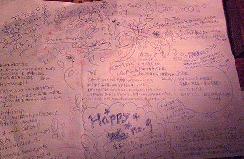 本当はね、こっちのblogではmixi日記に書いたこととは別のことを書こうと思ったんだけど、 僕が伝えたいことはひとつしかないんだ。 だからコピペします。ごめんね。 写真もらったらまたアップします。 ーーーーーーーーーーーーーーーーーーーーー これを見てくれている、仲間たちへ。 もちろん、no.9の音楽を聴いて、 ライブに駆けつけてくれるファンの方々にも心からありがとう。 でもね、僕が一番感謝しているのは仲間たち、 今見てくれているみんななんだ。 僕は気分屋でわがままで凄くちっぽけなのに、 いっつもみんながそこに居てくれて、期待してくれる。 野外パーティー蟲の響を始めてから、 全てが変わった。 みんなへの感謝を音に乗せて、 愛を込めて、 素晴らしいみんなと繋がって、 どうやったらみんなへのお返しが出来るのか、 いつも考えて音楽を創っています。 これからもきっとずっとそうなんだ。 ほんといつも来てくれてありがとう。 愛してるよ。 minaやhirokiをはじめ、そーき、いだっち、まきちゃん、ゆーじ、まっつん、ぴろりん、ネジ、きもと、たろちゃん、まいちゃん、もみ、もっち、みえ、なふ、しかじゅん、まや、けんちゃん、cab、マガリ夫妻、minaの弟たち、minaの大学時代の友人、どくたー、だいすけ、しょうへい、ウメさん、名古屋まで来てくれたtanachu、入れなかったリウタロ夫妻…。 何よりも!マジックバスを運転してくれるセーゴン!!!!! やさしさと友情の神だよ。 音楽を縁に繋がったみんな、dropのmasaくんやliquidのmasaくん、 もりっし、なつ、エリカ、くれみちゃん、げんめい、えろみち、toitoi、 メンバーの友達、ayaちゃんの仲間もみんな 仕事で知り合ったはなちゃんや大石さん、 音楽を通じて知り合ったアーティスト達、 kashiwa Daisukeさんや、haruka nakamura、akira kosemura、ametsub、mjuc、scohleのゆうまくん、funnelもausも一緒に出来たし、 そして、大阪の友達、ゆうすけ、まさやくん、わたりさん、まいちゃん、いおりさん、センセ…。それに京都から来てくれる三人も、お土産を持ってきてくれたsueさんも。 一緒にツアーをまわった、 michiくん、ゆうごくん、それに手伝ってくれたtomo、 ずっとPAをしてくださったAOさん。 AOさん無くして、orchestraの音はまとまりません。 学生時代からの友人、Nanofingers 明石と、駆けつけてくれた白山。 それにもちろん、メンバー全員とayaちゃん、ほんと心から大切なメンバーだよ。 最後にtaoとacoちゃん、君たちと出会えて僕は幸せです。 ありがとう。 全然書ききれないんだけど、 みんなのおかげで今の僕は頑張れる。 みんなが期待してくれたら、もっと必ず期待に応えてみせる。 だから、そこに居てくれて本当にありがとう。 俺、相当涙もろくなってて、歳かなw。 心に伝わる音楽を創るから、 また聞いてください。 ありがとう。 昨日は雨の中、本当に本当にありがとう。