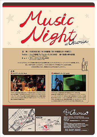 さて、急遽ライブのお知らせです。 再来週の平日ですが、汐留イタリア街のイタリアンレストランorioriaにて、 no.9のディナーショー的なライブがあります(笑) 友人のお誘いで実現したこのライブは不思議が一杯です… まず、その日には特別メニュー[ no.9 」カクテルが なんと900円にて出していただけるとの事(笑) 900円って便乗ですw。 さらに、 5000円食べ放題コースと、 2000円飲み放題コースという設定らしく、 会社帰りの空腹リッチな方か、 同じく会社帰りの貧乏酒豪の方はぜひいらしてください。 今回のno.9はorchestraのメンバーをほぼ総動員しての、 ラウンジバージョンにてライブします。 パーカッションや生バイオリン、ツインピアノと アコースティック感を強くしてやります。 ■no.9 LIVE@汐留orioria 2007.11.28(水) 18:00開場 / 20:00開演 (21:00終了) Table : シェフ特製ブッフェコース(¥5,000) 食べ放題・飲み放題 ※ コース料金にミュージックチャージを含みます。 Bar : フリードリンク(¥2,000) ※ミュージックチャージを含む、フード別。 http://www.orioria.jp/ ( no.9 solo + piano×2 + Guitar + Violin + Percussion + Visual michi) あと、本日はorchestraのメンバーで、ピアニストのtomoのバースデー。 おめでとう! 昨日は結局朝までayaちゃんの店で遊んでしまった…。むむむ。 さらに来週23日には先日山中湖にて開催されたSense of Wonderが スペースシャワーTVにて放映されるようです。 no.9は12/28に一曲分ライブが放送されます。誰かビデオ撮ってください(笑) PR 俺のことを知っている人も知らない人も、