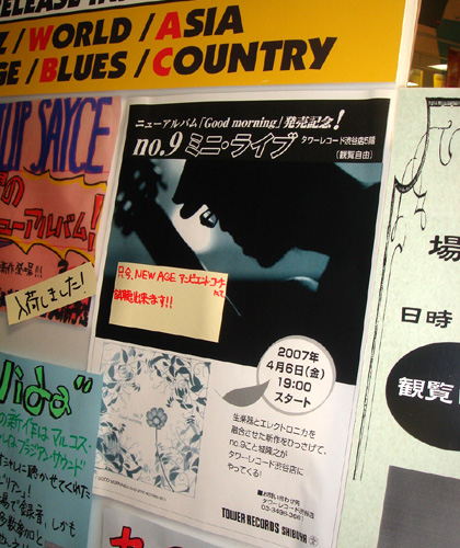 無事にインストアライブを終えて、ほっとしています♪ 写真が無いけど(泣) 久々のライブに、もの凄く興奮していて、 実はほとんど記憶が無い。。。 とても集中していたし、 内容も良かったはず? インストアライブって初めての経験だったので、 ちょっと新鮮だったなぁ。 あの明るい店内に、パイプいすが並べられて、フロアには自分のCDが流れる。 ライブ直前30分前、いつもと全く変わらない店内に少し不安を覚えたのもつかの間、 控え室から出て来て、いざライブを始めようと思ったら知った顔も知らない顔も、 CD棚を埋め尽くすお客さんでいっぱい。 その時点でかなり興奮していたのを覚えています。 きっと一緒に演奏したPianoのayaちゃんはえらく緊張しただろうね。 しかし、さすが女性は肝が据わっているのか、演奏は抜群でしたよ。 曲目は、Good morningから SHIFT Left the Wind Good morning Friend comes from east の4曲。途中アレンジでカノンをやったりして、 結局40分くらいやってしまうのがライブの面白い所。 いろんなハプニング(ハーモニカが裏返しw、曲が終われないw)などありましたが、 全く問題無し。(笑) それと、抽選で特典CD(no.9のアンリリース)が当たる抽選会まであって、 ちょっとした演歌歌手の営業的雰囲気も満載で我ながら笑えましたね。 とても愉しかった。 来てくれたみんな本当にありがとう。 特に、普段お仕事を一緒にやらせていただいているクライアントのみなさまが来てくれたことが嬉しかったです。ほんと一杯来てくれてました(笑) さらに、一緒に演奏をしてくれたayaちゃん、 企画をしてくれたp*dis下村さんと真加部さん、 渋谷タワーレコードの皆様、本当にありがとうございました! 次は6月10日のno.9 orchestra@アサヒアートスクエア。 がんばります! いよいよ今週はインストアライブです。