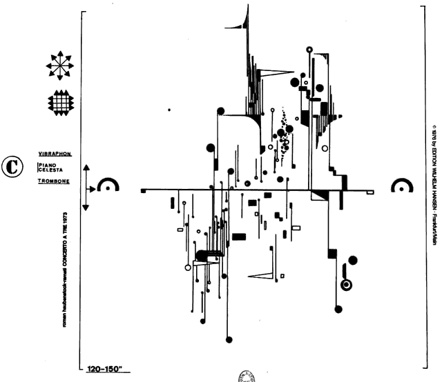 すでにラジオ番組のように、毎朝これを書く事が日課になりつつあります。 今日はこれからスタジオワークなので、気持ちを音楽に向けています。 下の写真は、いわゆる『図形楽譜』と言われているものです。 図形楽譜とはサウンドアートの一種で、コンセプトや演奏記号をデフォルトしてあったり、 見た目の印象による演奏の違いをイメージしてあったりするものです。 Roman Haubenstock-Ramati (1919〜) "Concerto a tre" (1973) いったいどんな音が鳴るのでしょうね♪ 音楽には作者なりのコンセプトがあるものが私は好きです。 どんな音にも意味があるから。 まぁ、かっこよければいいじゃん。と思うかもしれないけど、 偶然に任せていると、毎日確実に良い音楽を生み出せるという確証は持てないからね。 クラシックの基本は音の存在意義にもっとも忠実なんじゃないかな。 残るものは録音物よりも楽譜なんだから。 それの正反対なものがインプロビゼーションやFREE JAZZ。 今を生きる。という音がある。 まぁ、本当にかっこいいものは稀だけど(俺にとって) 僕にもの凄く影響を与えてくれたエリック・ドルフィーは、 自身最後のアルバムでこう言っている。 When you hear music. after it's over,it's gone in the air.You can never capture it again. (音楽は聴き終えると、空中に消え去ってしまう。もう二度とそれを取り戻すことはできない。) さらに、自分にはこう聞こえます。 「だから、演奏者は自分が放つすべての音に責任をもたなければならない」 かぁぁぁっこいい♪(笑) THE 男らしい。 これは色んな事に言えるんじゃない? そんな中で偶然性を利用し、「無作為」を操る奇才、ジョン・ケージ。 彼のコンセプトワークは世界中の音楽に密かに影響を与えています。 彼のもっとも有名な作品 [ 4:33 ]はピアノのあるステージに立ち、 ピアノを弾くという行為をしないという一見かなりへそまがりな行為。 だが、本質は客席や会場に仕込まれたマイクや増幅装置のためのノイズミュージックが目的だった。 まぁ、これの評価はさておき、 目線を変える発想は、新しい何かを見つけてくれるよ。きっと。 今日も一日、何か素敵な事を見つけよう。