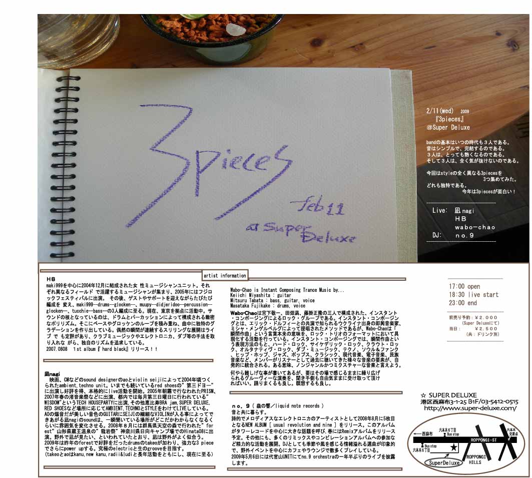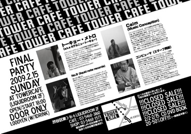 一年間、東京を離れていたのです。 そして、また東京に戻って来た。 音楽とはずっと一緒に居たけど、 これからはもっと色々大切にしなきゃと思っています。 朝起きて、淹れる珈琲にまた喜びを感じています。 さて、早速ですがまずはDJから復活します。 2.11(祝日) 3piece @ SuperDeluxe open 17:00 / Start 18:30 end 23:00 Fee adv.2000円 / Door.2500円 (ドリンク別) bandの基本はいつの時代も3人である。音はシンプルで、完結するのである。3人は、とっても熱くなるのである。そして3人は、全く気が抜けないのである。 今回はstyleの全く異なる3piecesを3つ集めてみた。どれも独特である。今年は3piecesが面白い! Live: 凪、HB、wabo-chao / DJ: no.9 ーーーーーーーーーーー そして、いよいよライブも復活します。 まずはソロで2月15日の恵比寿のLiquid room2階にあるタワレコカフェの クロージングパーティーに参加します。 2年半前、お寺でのライブ以来の一人でのライブ。 usual revolution and nineリリース後初のライブ。 楽しもう。音を楽しんで、演奏します。 よかったら是非遊びに来て、声をかけてくださいね。 見かけより優しいです(笑) 今年は一杯、音を出します。 ぜひ、聞いてください。 ::追記です:: 2月15日の詳細です。 Tower Cafe Final(Closed) Party 2009.2.15 Sunday at TOWER CAFE(LIQUIDROOM 2F) open/start 18:00 door only 1,000yen(w/1Drink) Live: no.9(liquid note records) トーキョー・メトロ(a.k.a ホテルニュートーキョー) DJs: Calm(Music Conception) コンピューマ(スマーフ男組) no.9のライブは20時頃です。 PR